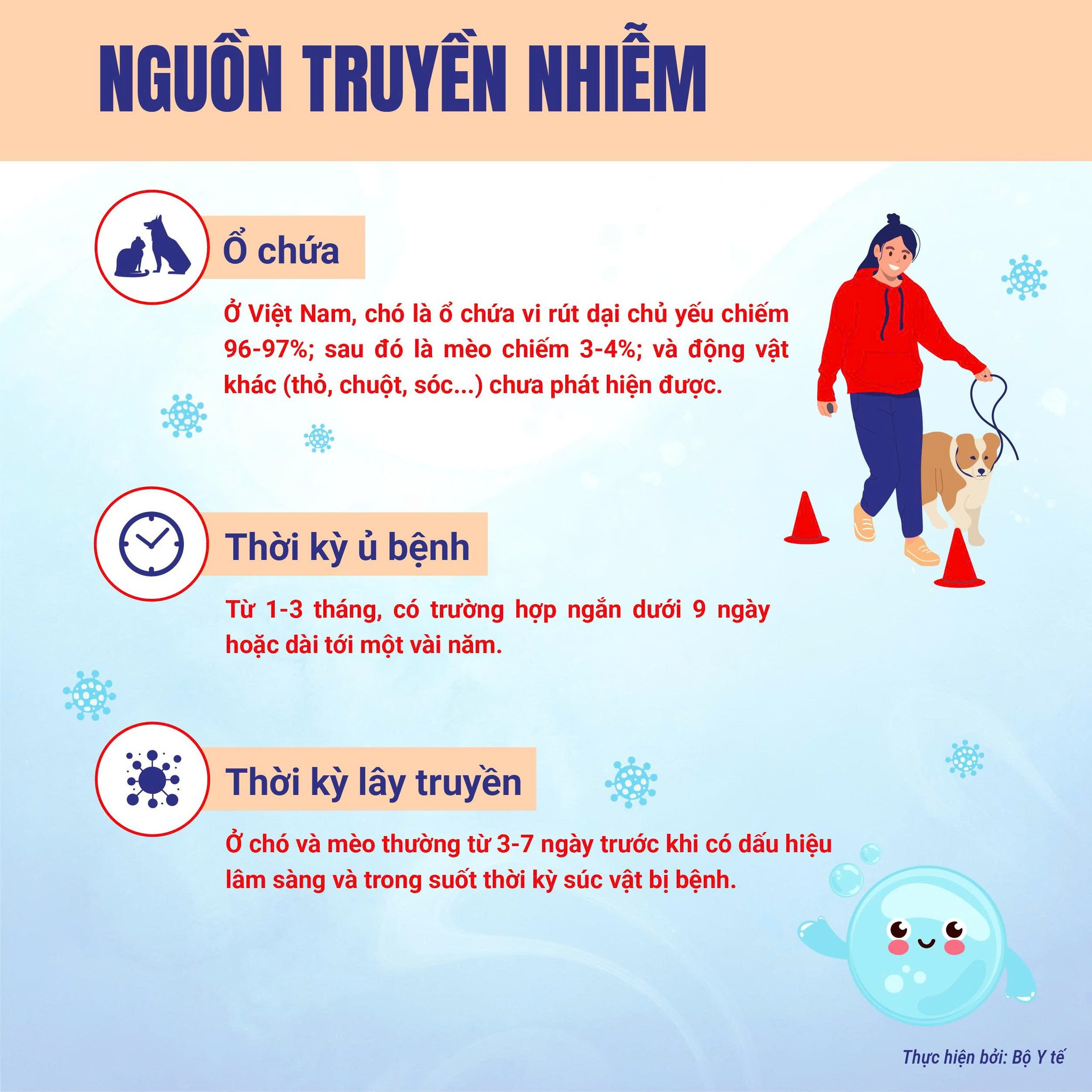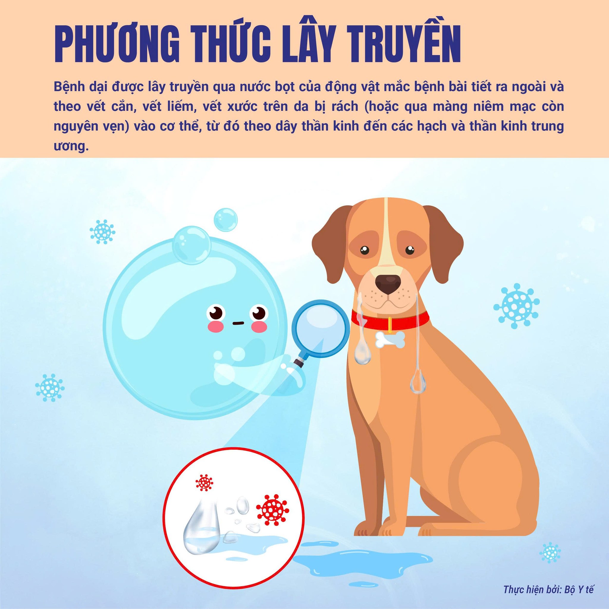 Virus có trong nước bọt động vật dại, lây sang người qua vết cắn, vết cào, liếm trên da trầy xước hoặc niêm mạc.