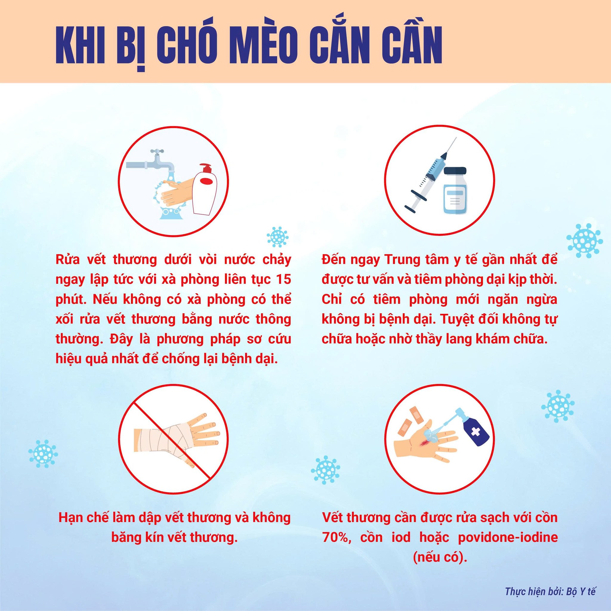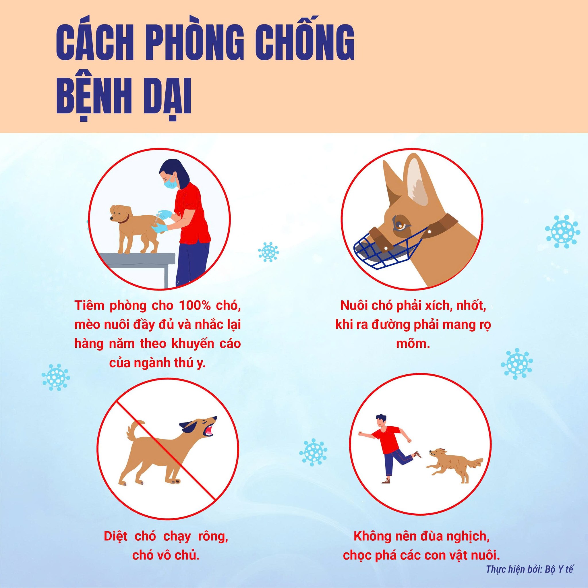 Tiêm phòng dại cho 100% chó, mèo và nhắc lại hàng năm theo khuyến cáo ngành thú y.