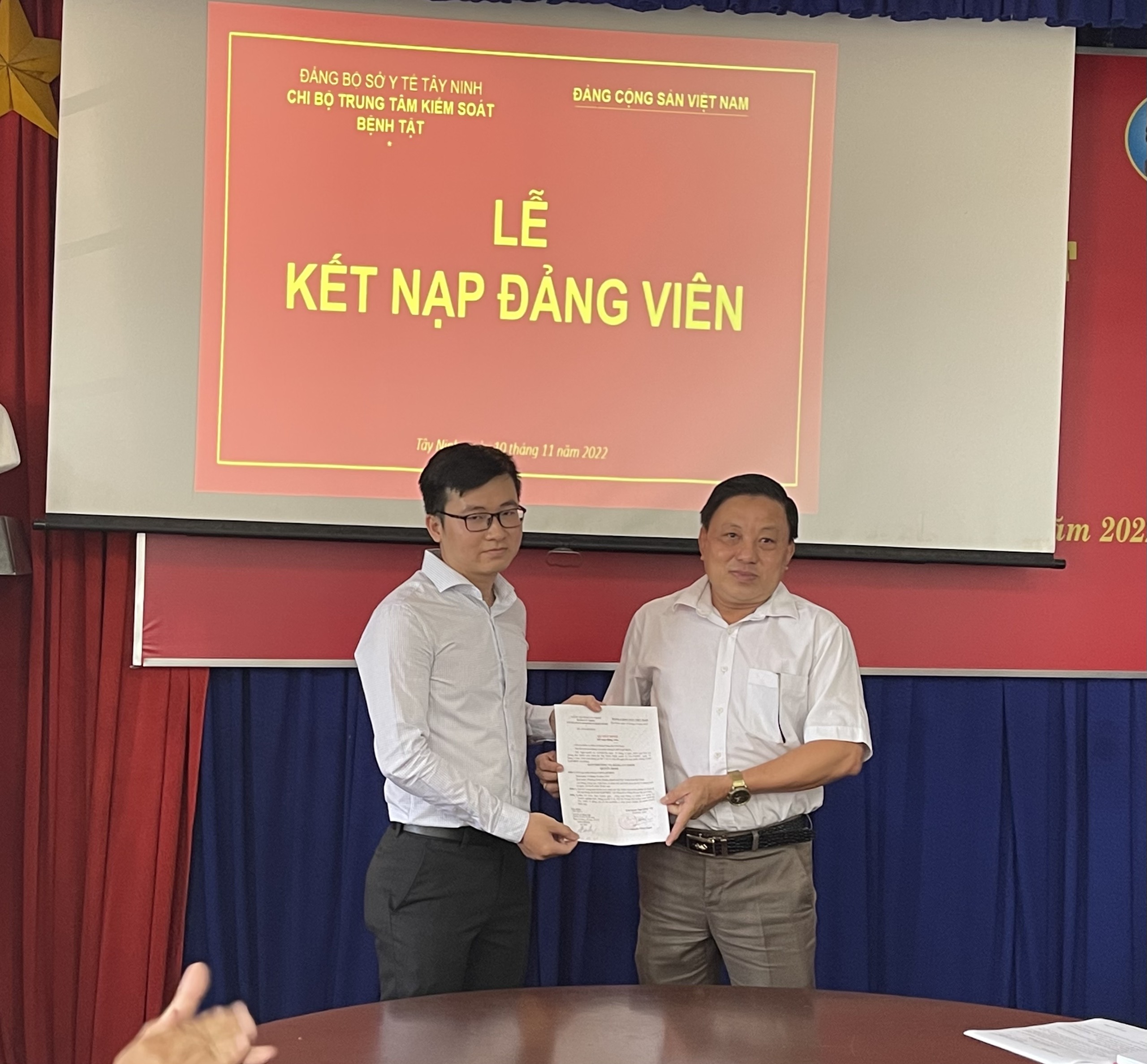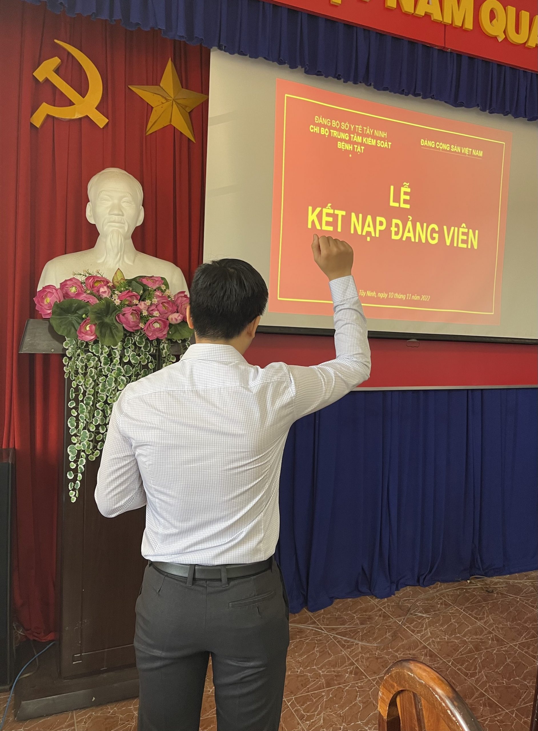 Thực hiện Quyết định số 1754-QĐ/ĐUK ngày 20 tháng 10 năm 2022 của Đảng ủy khối các cơ quan và doanh nghiệp tỉnh về việc kết nạp đảng viên, ngày 11.11.2022 Chi bộ Trung tâm Kiểm soát bệnh tật Tây Ninh đã tổ chức Lễ kết nạp đảng viên cho quần chúng ưu tú Cao Lập Đức – Khoa khám. Tham dự buổi lễ có đồng chí Trần Huyền Trân, Phó Bí thư chi bộ, Phó Giám đốc và toàn thể Đảng viên Chi bộ Trung tâm Kiểm soát bệnh tật. Lễ kết nạp được diễn ra trong không khí trang nghiêm, đúng trình tự, thủ tục của Điều lệ Đảng. Tại buổi lễ, đồng chí Trần Huyền Trân, Phó Bí thư chi bộ đã công bố và trao Quyết định kết nạp đảng viên cho đồng chí Cao Lập Đức. Đồng thời, dặn dò đồng chí Đảng viên mới cần phải luôn rèn luyện tu dưỡng, nâng cao bản lĩnh chính trị và năng lực công tác để đáp ứng yêu cầu nhiệm vụ mới, xứng đáng là một người đảng viên.