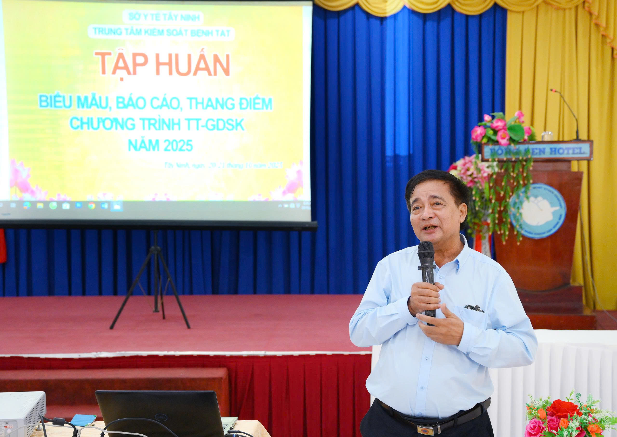 Từ ngày 20-23.10.2025, tại phường Long An và phường Tân Ninh Trung tâm Kiểm soát bệnh tật tỉnh Tây Ninh (CDC) tổ chức tập huấn biểu mẫu, báo cáo, thang điểm chương trình Truyền thông-Giáo dục sức khỏe (TT-GDSK) năm 2025 cho hơn 150 học viên là cán bộ, nhân viên y tế phụ trách công tác truyền thông bệnh viện tuyến tỉnh, Trung tâm Y tế khu vực, Trạm y tế trên địa bàn tỉnh Tây Ninh. Phó Giám đốc Trung tâm Kiểm soát bệnh tật – Bác sĩ CKI Lê Văn Lất đến dự và khai mạc tập huấn.