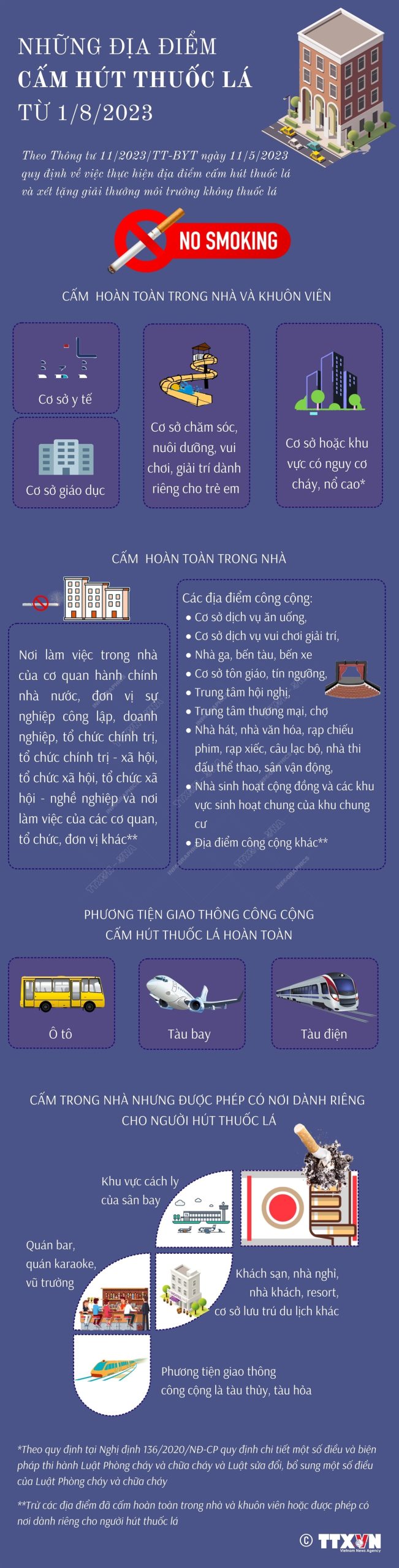 Thông tư số 11/2023/TT-BYT do Bộ Y tế ban hành ngày 11/5/2023 quy định về việc thực hiện địa điểm cấm hút thuốc lá và xét tặng “Giải thưởng Môi trường không thuốc lá”.