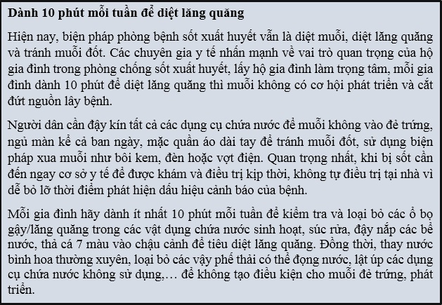 Phát huy vai trò của chính quyền và các tổ chức, đoàn thể trong công tác phòng, chống dịch bệnh SXHD, Zika và Chikungunya. Phát động phong trào sâu rộng trong cộng đồng nhằm khuyến khích người dân tham gia tích cực chiến dịch diệt lăng quăng, vệ sinh môi trường phòng, chống dịch bệnh SXHD, Zika và Chikungunya tại cơ quan, đơn vị, nơi ở và tại cộng đồng.