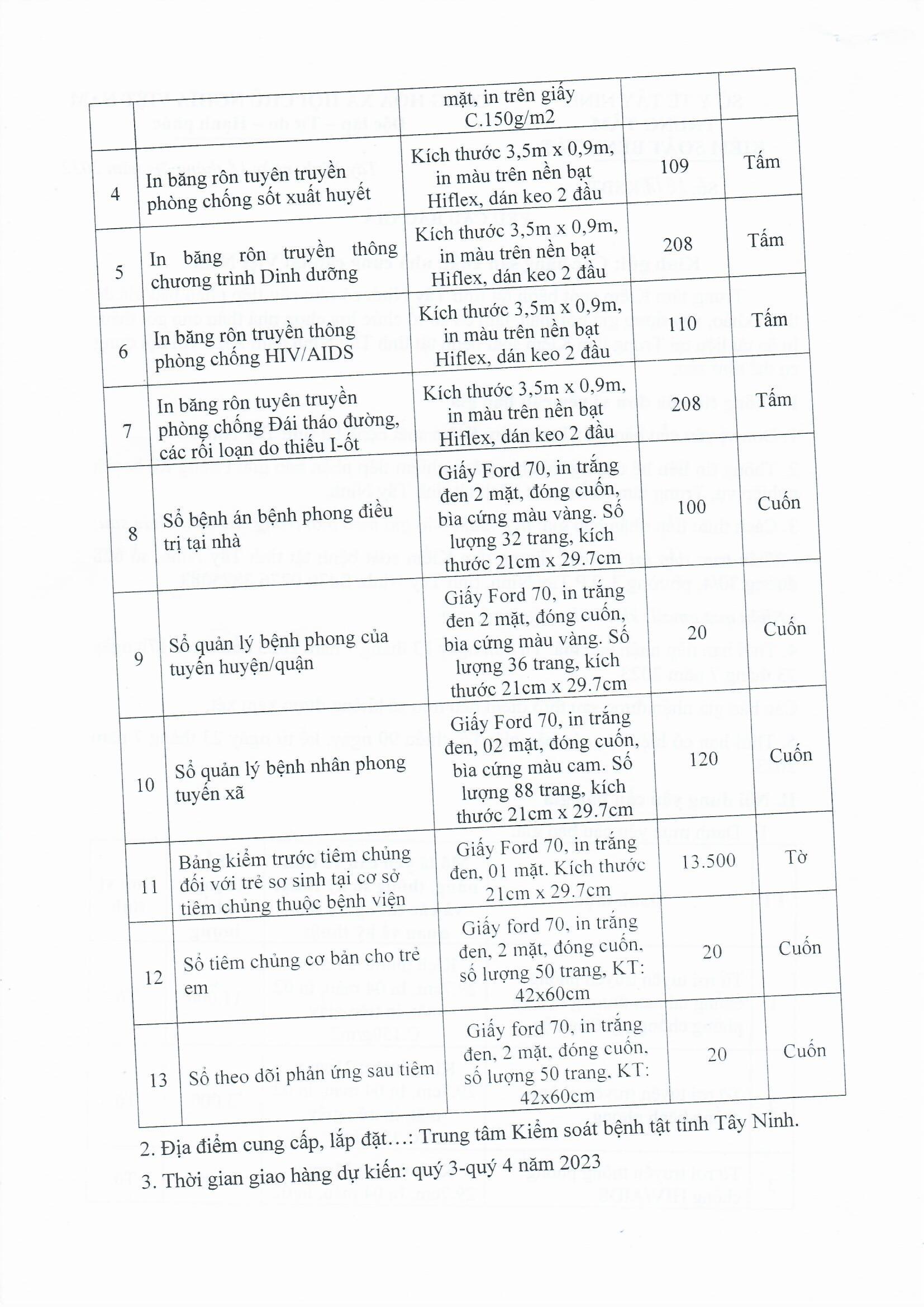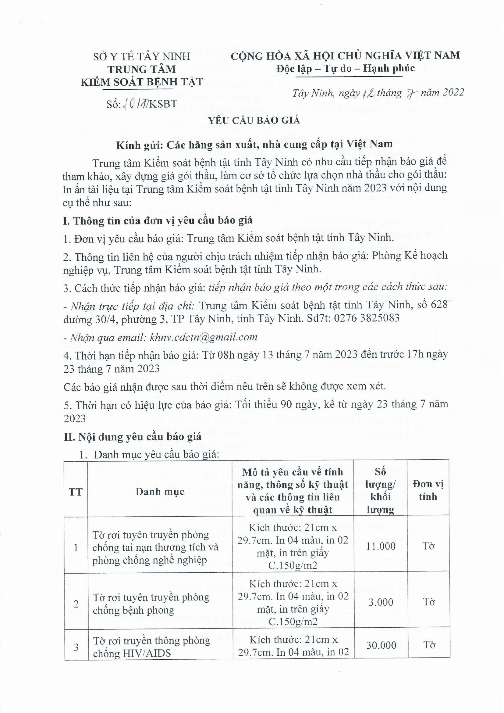 Trung tâm Kiểm soát bệnh tật tỉnh Tây Ninh có nhu cầu tiếp nhận báo giá để tham khảo, xây dựng giá gói thầu, làm cơ sở tổ chức lựa chọn nhà thầu cho gói thầu: In ấn tài liệu tại Trung tâm Kiểm soát bệnh tật tỉnh Tây Ninh năm 2023 với nội dung cụ thể như sau: