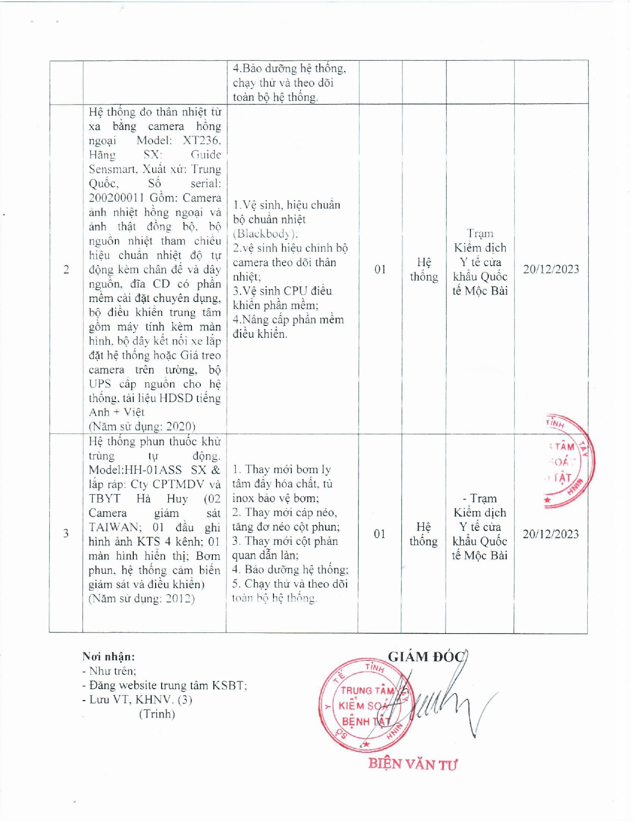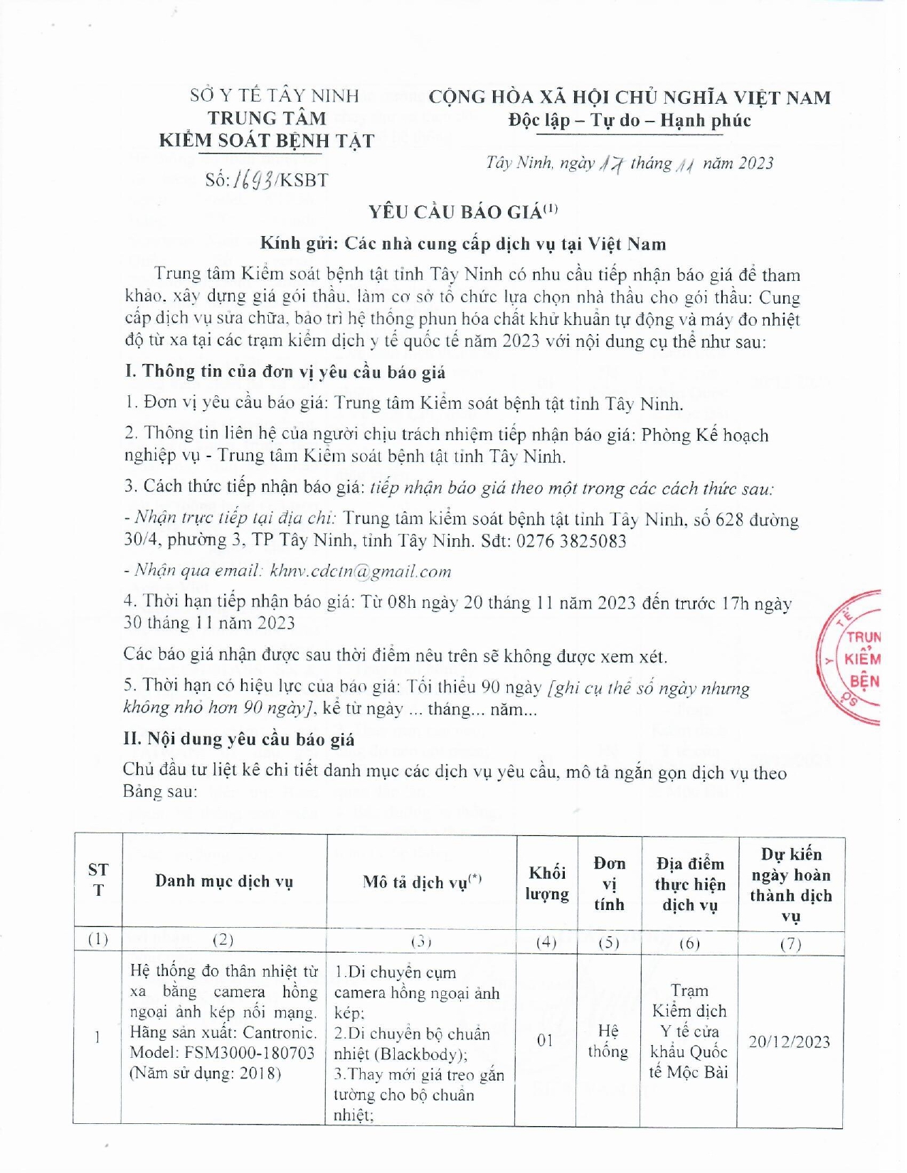 Trung tâm Kiểm soát bệnh tật tỉnh Tây Ninh có nhu cầu tiếp nhận báo giá để tham khảo, xây dựng giá gói thầu, làm cơ sở tổ chức lựa chọn nhà thầu cho gói thầu:Cung cấp dịch vụ sửa chữa, bảo trì hệ thống phun hoá chất khử khuẩn tự động và máy đo nhiệt độ từ xa tại các Trạm Kiểm dịch Y tế quốc tế năm 2023 với nội dung cụ thể như sau: