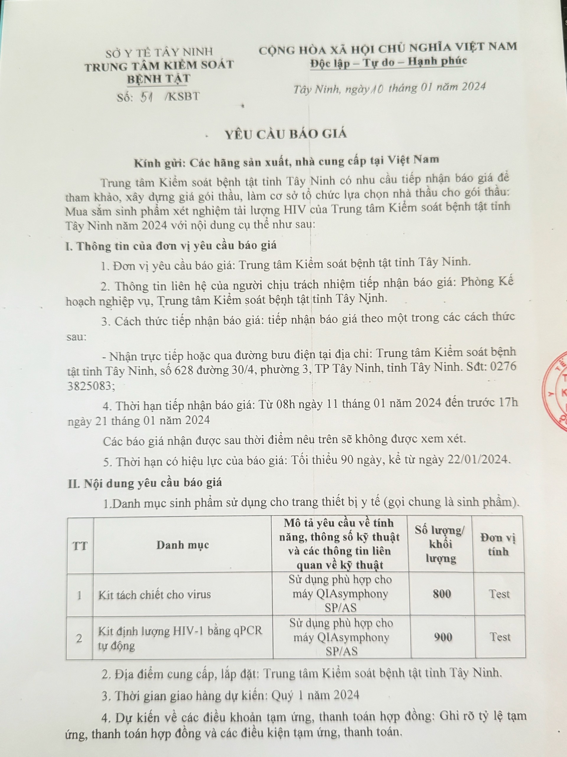 Trung tâm Kiểm soát bệnh tật tỉnh Tây Ninh có nhu cầu tiếp nhận báo giá để tham khảo, xây dựng giá gói thầu, làm cơ sở tổ chức lựa chọn nhà thầu cho gói thầu: Mua sắm sinh phẩm xét nghiệm tải lượng HIV của Trung tâm Kiểm soát bệnh tật tỉnh Tây Ninh năm 2024 với nội dung cụ thể như sau: